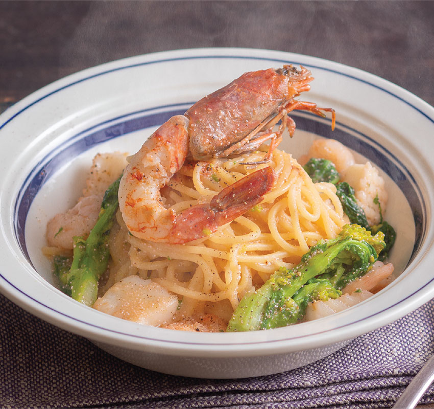 ほろ苦い味わいが特長の旬の菜の花。有頭海老、赤いか、明太子など魚介の旨みたっぷりな白だしベースのソースで仕立てました。