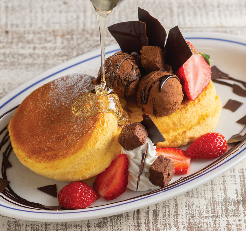 ふんわりパンケーキになめらかなガナッシュクリームと濃厚な味わいの生チョコレートを合わせました。