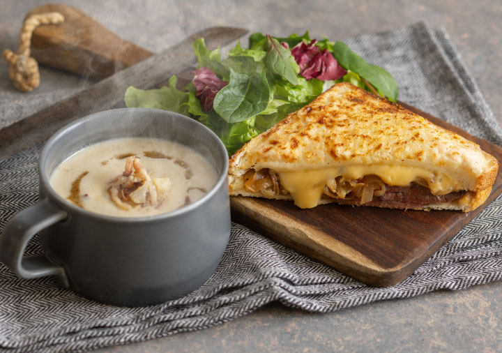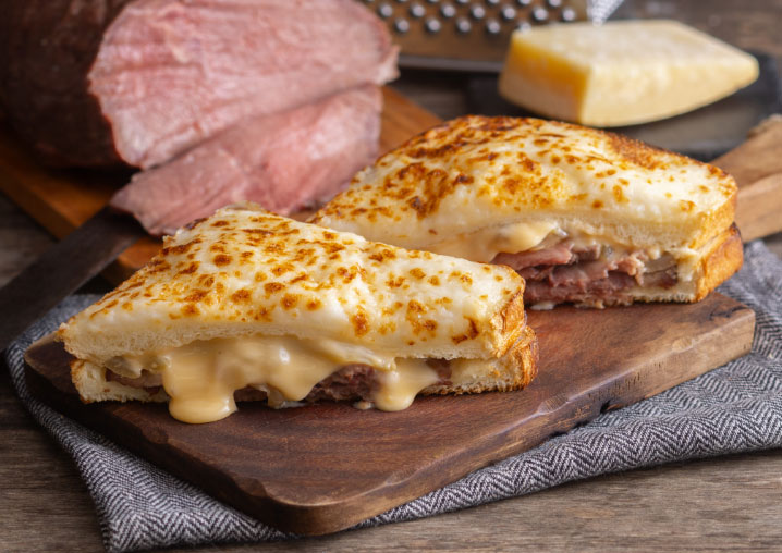 ローストビーフに甘みのある玉ねぎ、濃厚なチーズソースをサンド。クリーミーなベシャメルソースをこんがり焼いて。
