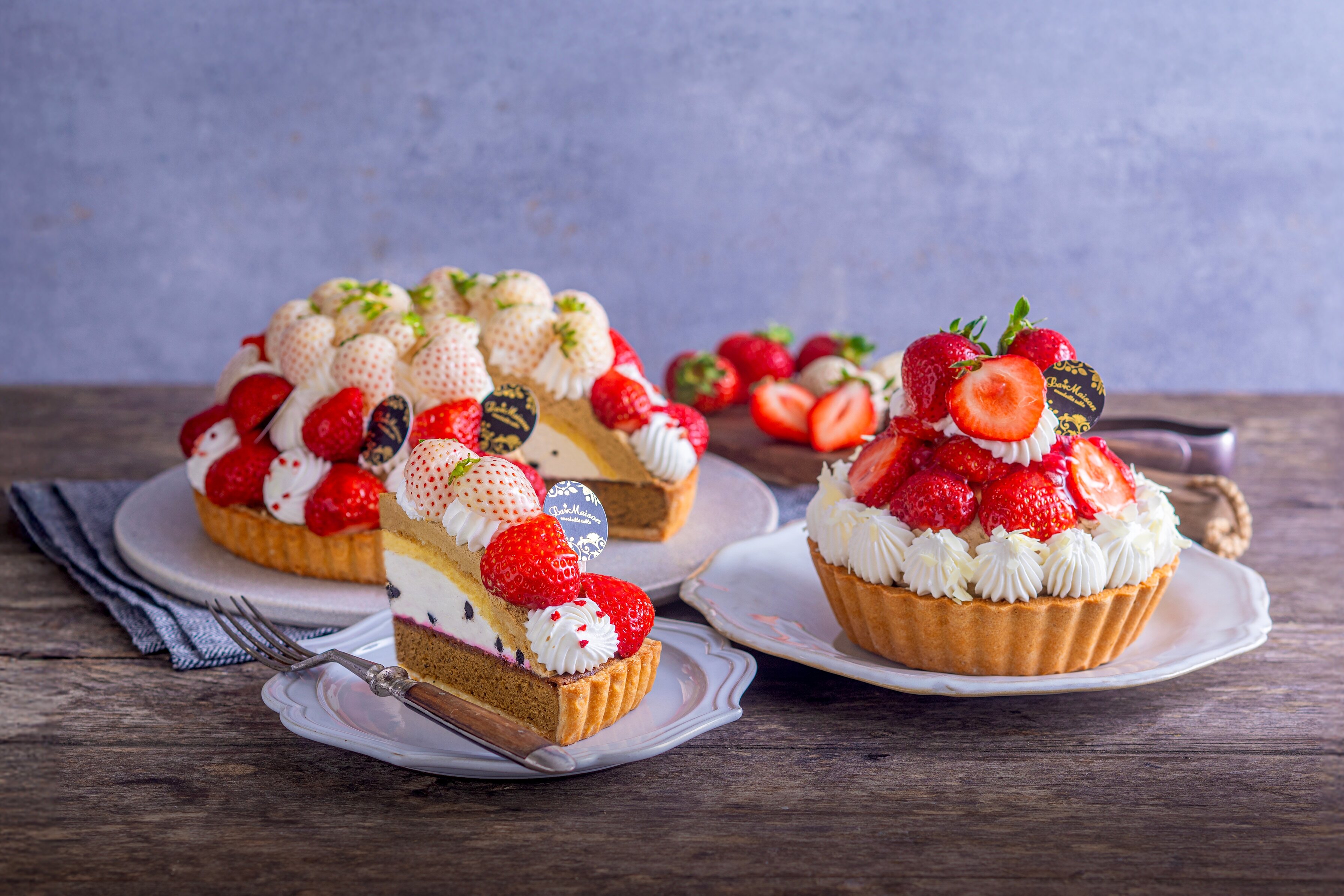 3月は、爽やかな香りの千葉県産「白いちご」と大粒でコクのある福岡県産「あまおう」、糖度が高くバランスの良い栃木県産「とちあいか」を使用したタルトをご用意しました。