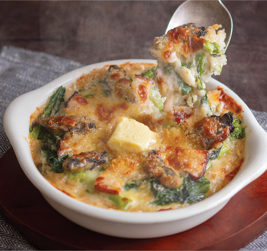 豊かな漁場で育つ旨みの強い糸島カキ、アンチョビでソテーした旬の菜の花とともに。