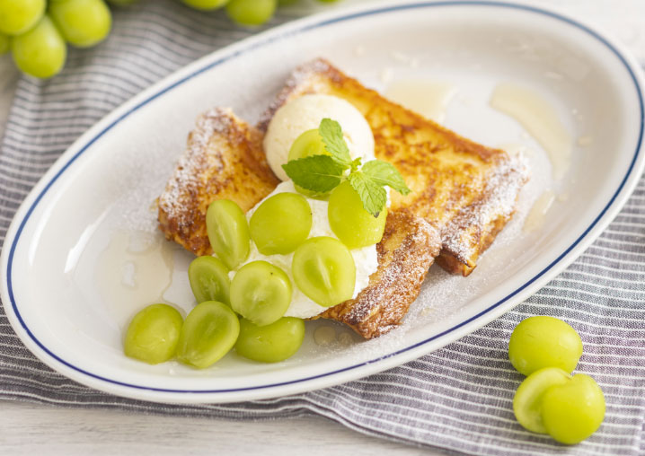 メゾンカイザーブレッドをアパレイユにじっくり漬け込みフレンチトーストにし、香りの良いシャインマスカットに相性が良いフロマージュクリームを合わせました。