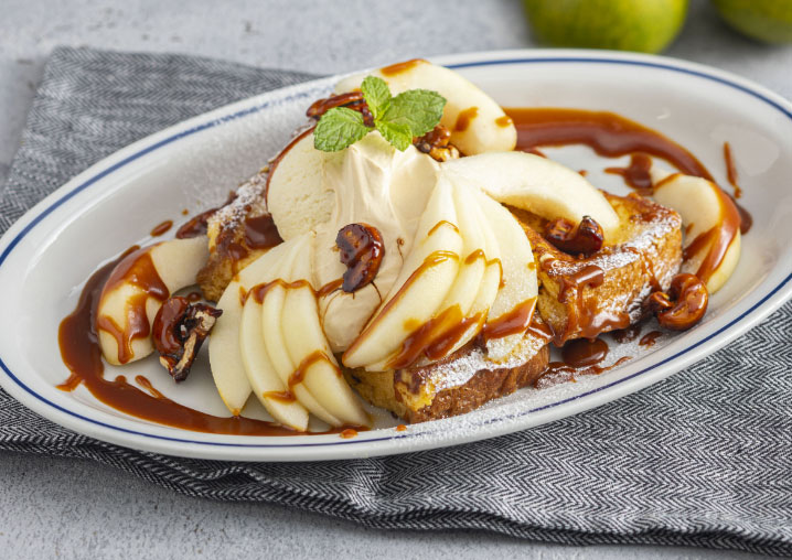 メゾンカイザーブレッドをアパレイユにじっくり漬け込みフレンチトーストにし、旬のラ・フランスと相性が良いキャラメルとミルクティークリームを合わせました。