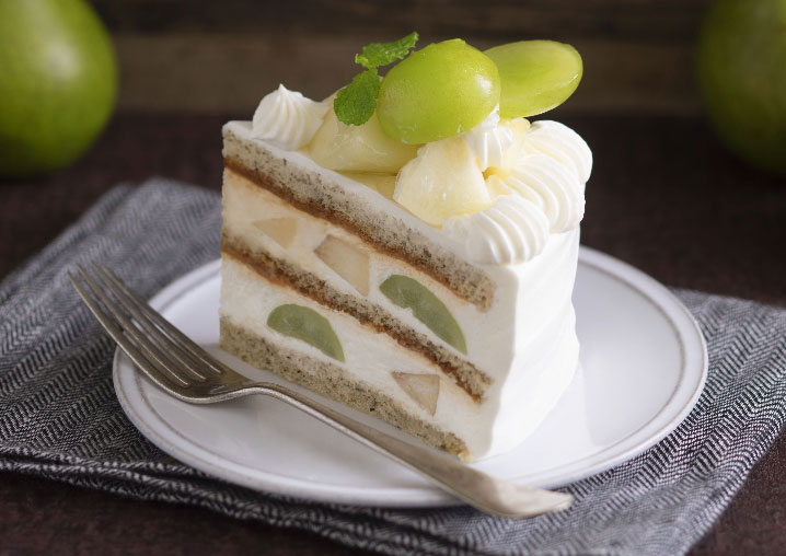 香りの良いラ・フランスとシャインマスカットをアールグレイ香る紅茶スポンジでサンドした贅沢なショートケーキ。