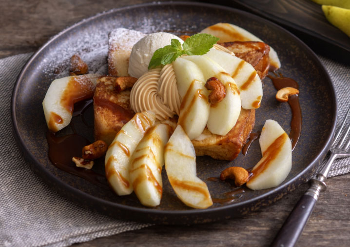 メゾンカイザーブレッドをアパレイユにじっくり漬け込みフレンチトーストにし、旬のラ・フランスと相性が良いキャラメルとミルクティークリームを合わせました。