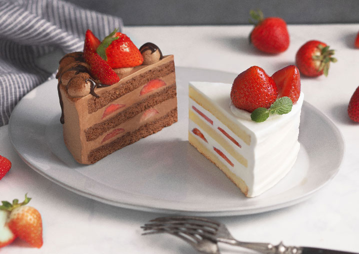ふんわりココアスポンジとチョコクリームで、甘酸っぱいいちごをサンドしたショートケーキです。
