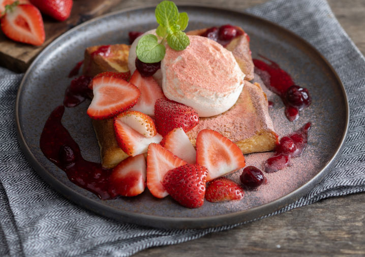 メゾンカイザーブレッドをアパレイユにじっくり漬け込みフレンチトーストにし、コクのあるマスカルポーネクリームとジューシーなあまおうを合わせました。