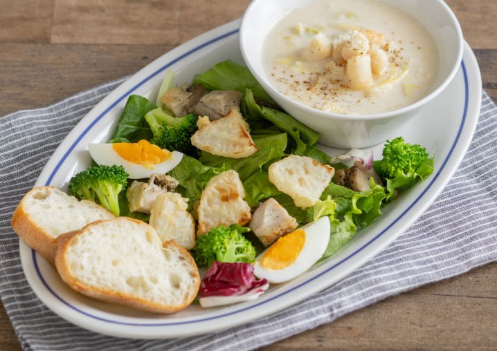 茨城県産の甘みの強い「とろとろ白菜」を使用したクラムチャウダーと、しょうなんブロッコリーや大根のフリットをのせたサラダを合わせました。